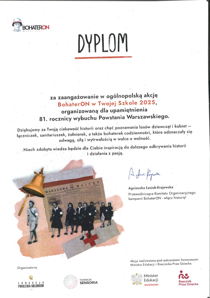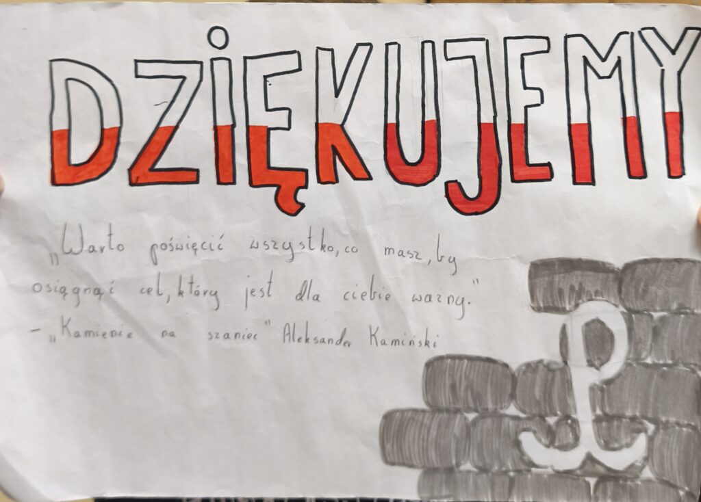 Tegoroczna akcja poświęcona była kobietom i dziewczętom bohaterkom Powstania Warszawskiego. We wrześniu i październiku uczniowie od najmłodszych klas uczestniczyli w akcji. W trakcie zajęć lekcyjnych oraz działań projektowych realizowali różnorodne zadania, których celem było pogłębienie wiedzy na temat Powstania Warszawskiego i szczególnej roli jaką odegrały kobiety i dziewczęta w tym trudnym czasie. Odpowiednio do poziomu nauczania uczniowie zapoznali się z materiałami edukacyjnymi udostępnionymi przez organizatora. Następnie wykonali plakaty i kartki z podziękowaniami dla Powstańców. W październiku uczniowie klasy 7 i klas 8 odbyli wycieczkę na Warszawskie Powązki, gdzie odwiedzili i zapalili znicze przy powstańczych grobach w tym grobie ostatniego Warszawskiego Robinsona zmarłego w grudniu 2024 roku Wacława Gluth-Nowowiejskiego.