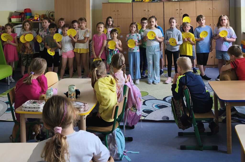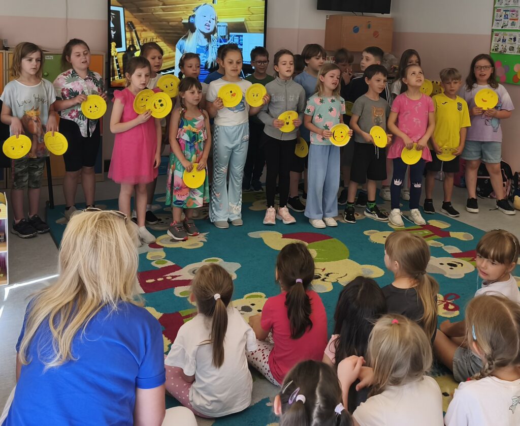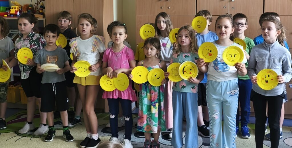 Uczniowie klasy I w bieżącym roku szkolnym realizowali innowację pedagogiczną „ Nazywam, rozpoznaję i akceptuję emocje”. W ramach innowacji uczniowie zostali wprowadzeni w świat emocji w sposób spójny, rozpoczynając od podstawowej wiedzy związanej z właściwym rozpoznawaniem i nazywaniem emocji, zapoznali się z sześcioma podstawowymi emocjami, nauczyli się je rozpoznawać i nazywać. Następnie wykorzystywali zdobytą wiedzę w praktyce wykonując przez 4 miesiące emocjonalne motyle. Teraz są ich świadomymi i potrafią je zaakceptować, a tym samym właściwe na nie odpowiadać. Chcąc podzielić się zdobytymi umiejętnościami, w ostatnim tygodniu roku szkolnego odwiedzili dzieci z oddziałów 0 oraz kilka klas młodszych i zaprezentowali zdobytą wiedzę śpiewając piosenki o emocjach.