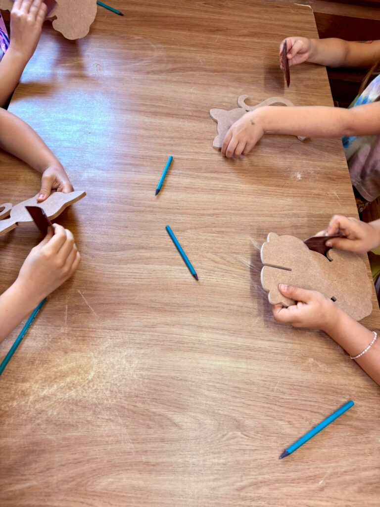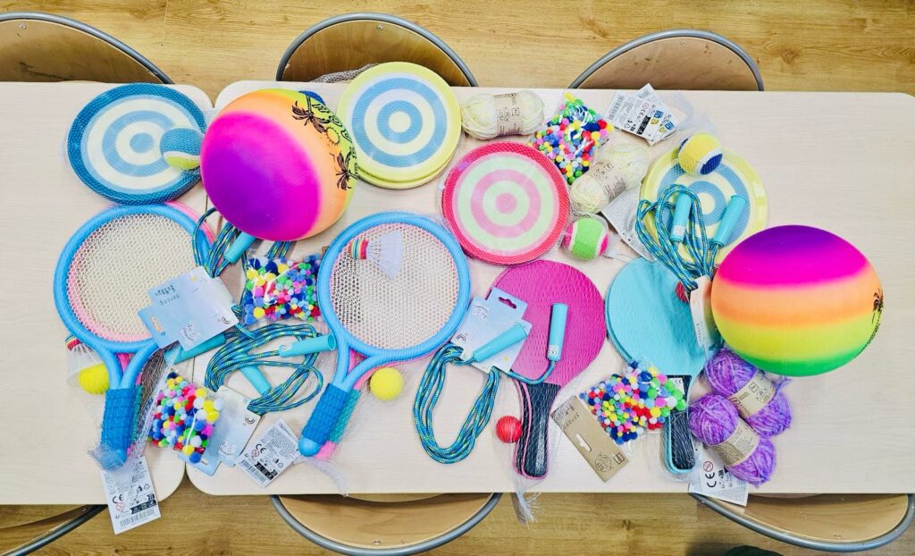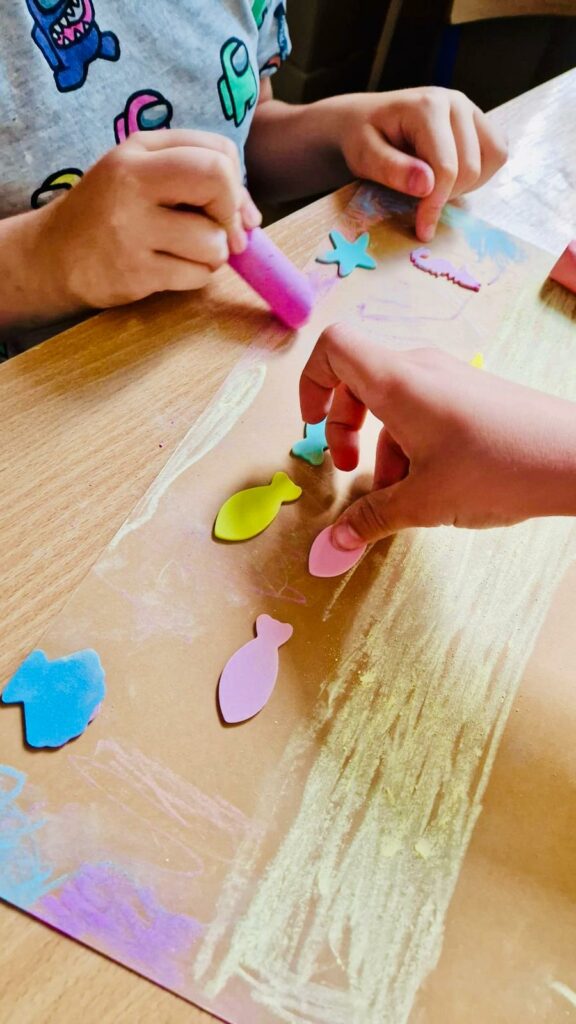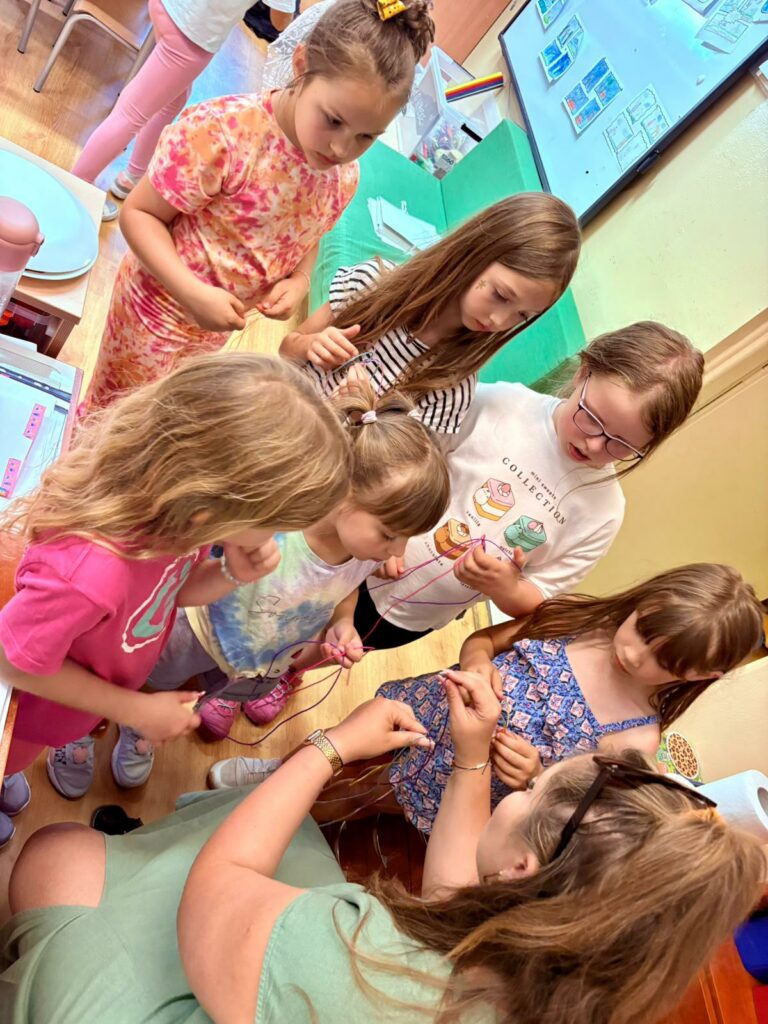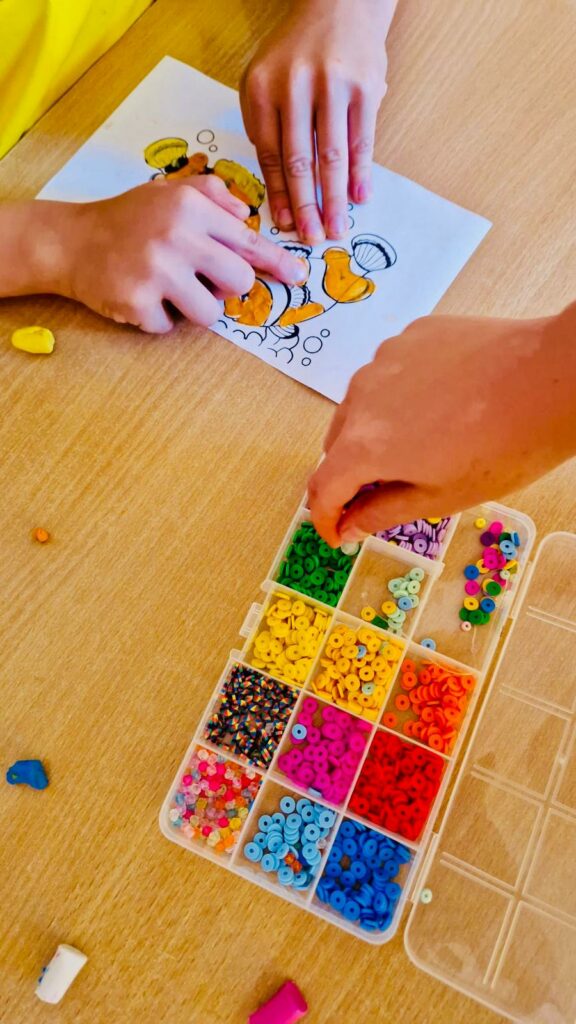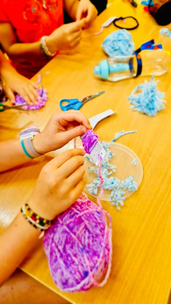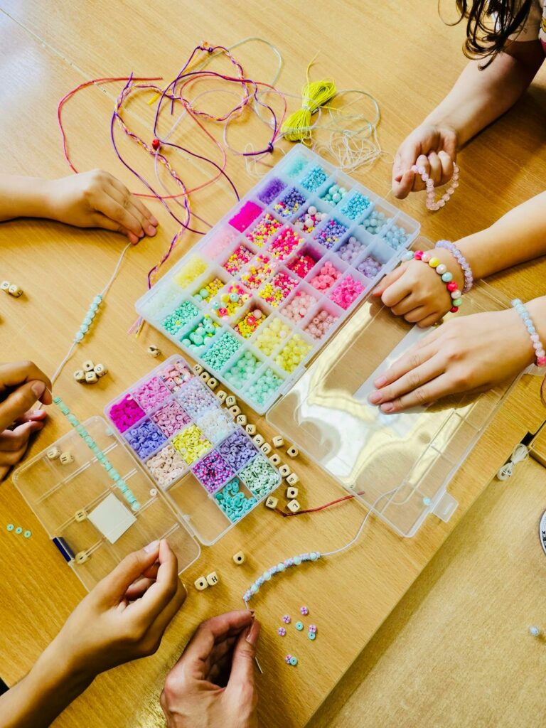 - zajęcia kreatywne, podczas których dzieci tworzyły bransoletki i breloczki, wykorzystując koraliki, sznurki i kolorowe dodatki,