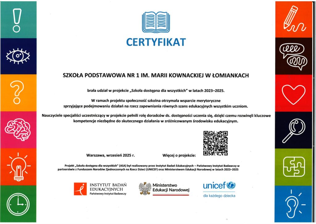 Z radością informujemy, że Szkoła Podstawowa nr 1 im. Marii Kownackiej otrzymała Certyfikat za udział w projekcie „Szkoła dostępna dla wszystkich” w latach 2023–2025. To wyróżnienie potwierdza nasze zaangażowanie w tworzenie przyjaznego i dostępnego środowiska dla wszystkich uczniów.