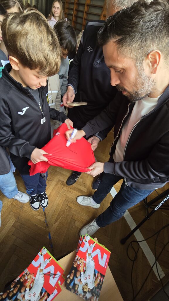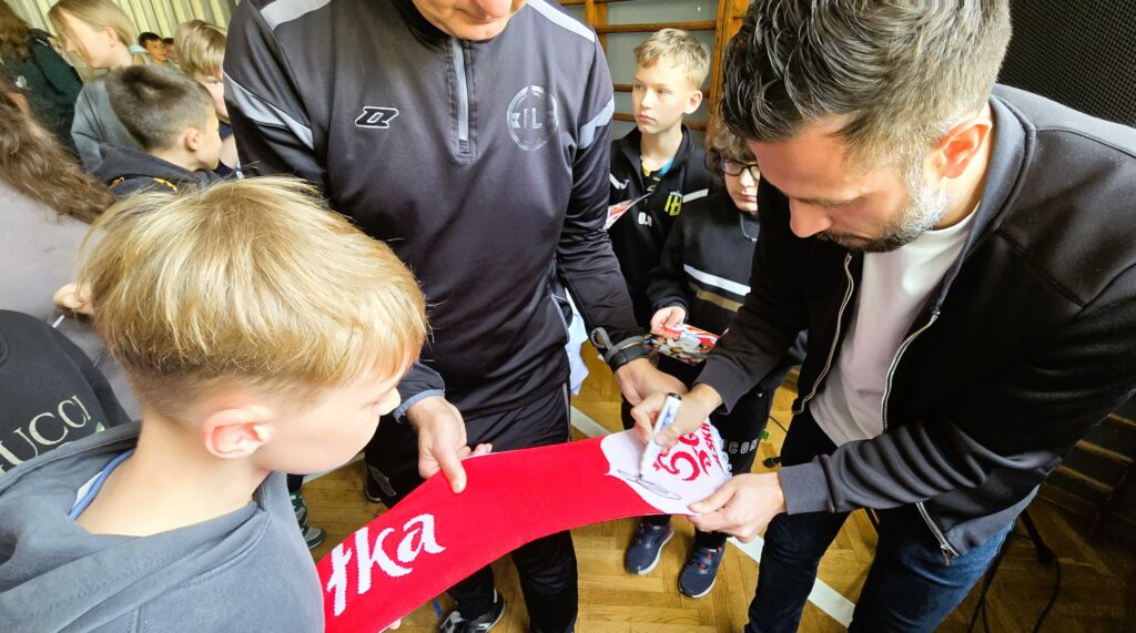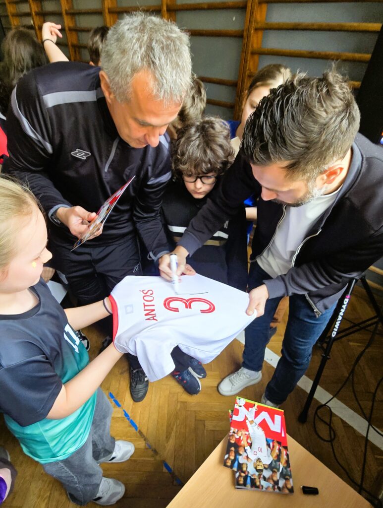 Na zakończenie spotkania na uczniów czekała wyjątkowa niespodzianka — Pan Maciej z ogromną życzliwością rozdawał autografy, sprawiając dzieciom mnóstwo radości i pozostawiając pamiątkę, która na długo zostanie w ich pamięci.