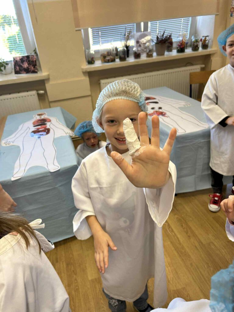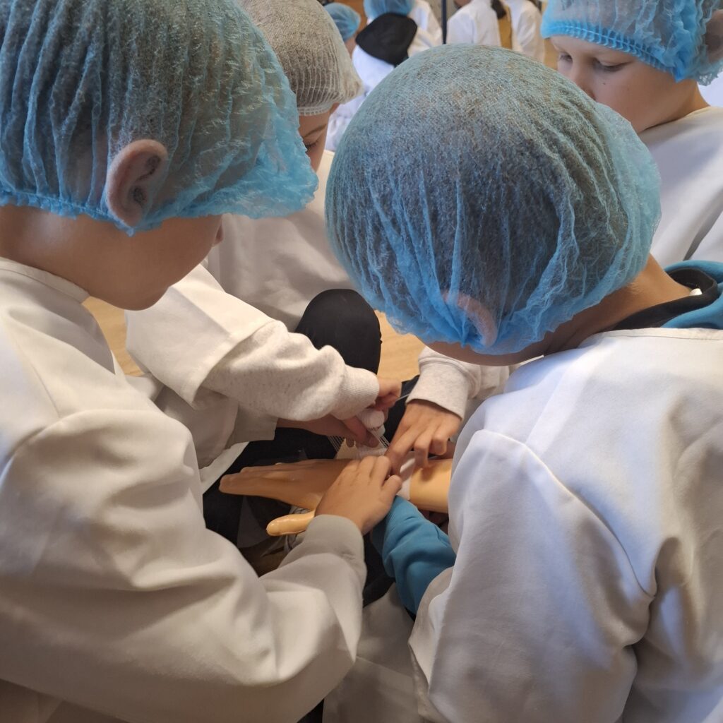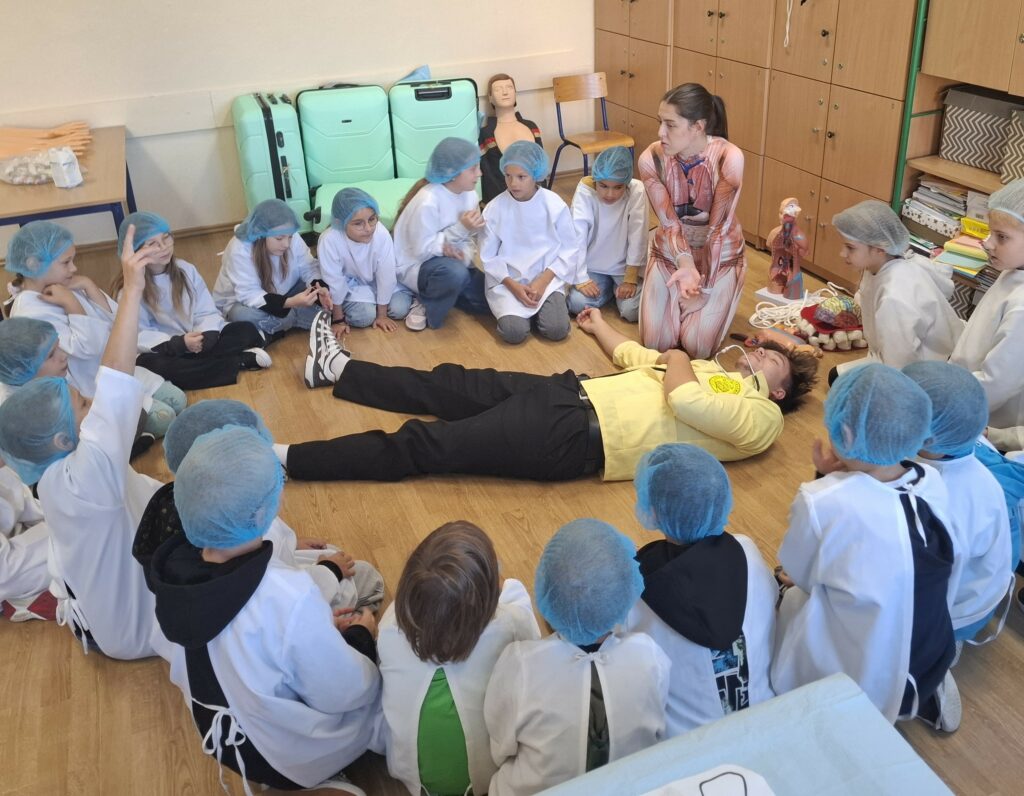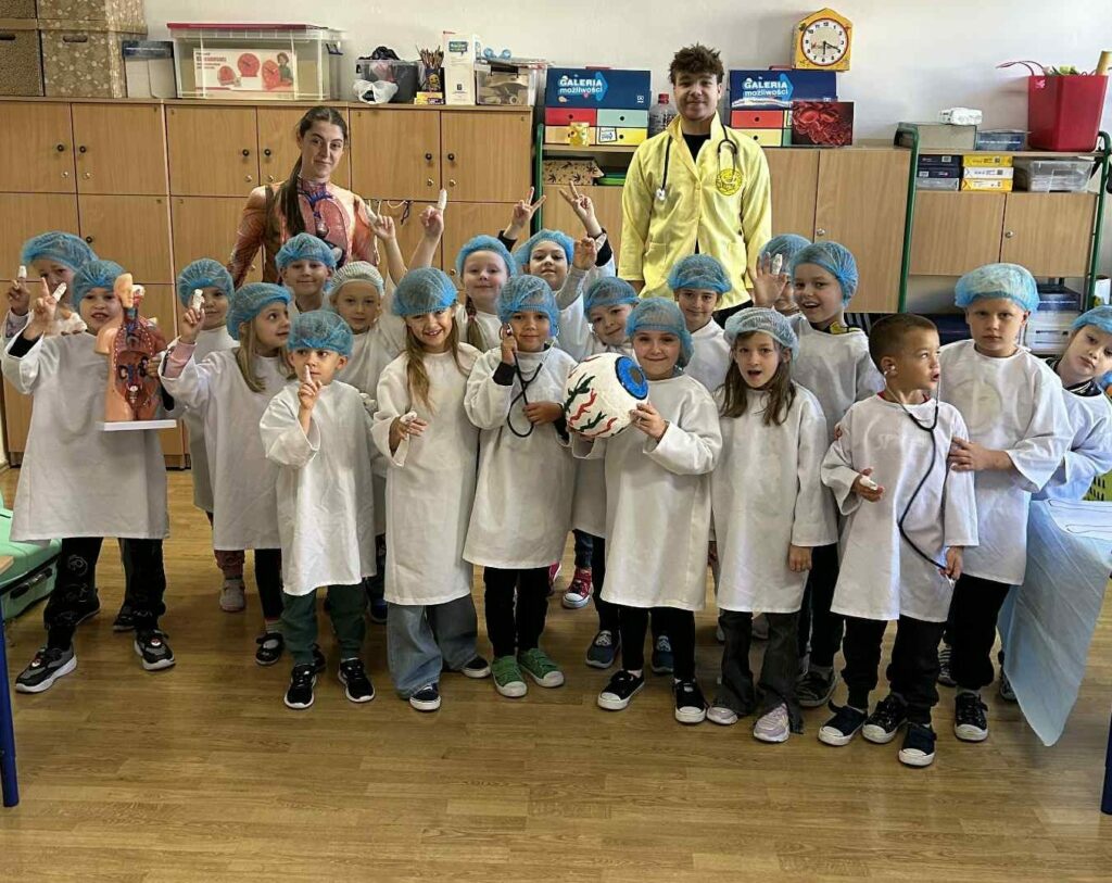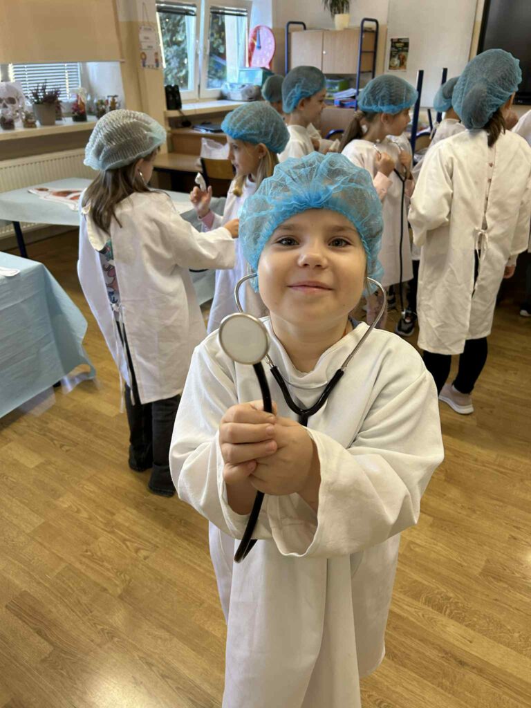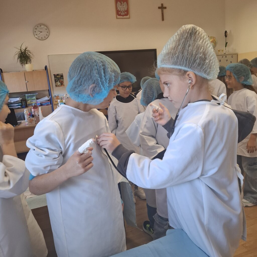 W dniach 25-26 września 2025r. w klasach I-III  odbyły się warsztaty  medyczne . Dzieci poznały na modelach jak zbudowany jest człowiek, jego komórki, mózg, język, oczy, serce.  Uczyły  się opatrywać rany, zakładać gips na palec, reagować w sytuacji zagrożenia życia i zdrowia oraz poprawnej komunikacji i wzywania pomocy. Każde dziecko  miało możliwość samodzielnie wykonać RKO na manekinie. Umiejętność udzielania pierwszej pomocy to jedna z najważniejszych kompetencji życiowych . W sytuacjach kryzysowych liczy się szybka reakcja, dlatego tak ważne jest, aby dzieci już od najmłodszych lat uczyły się podstaw ratowania życia.