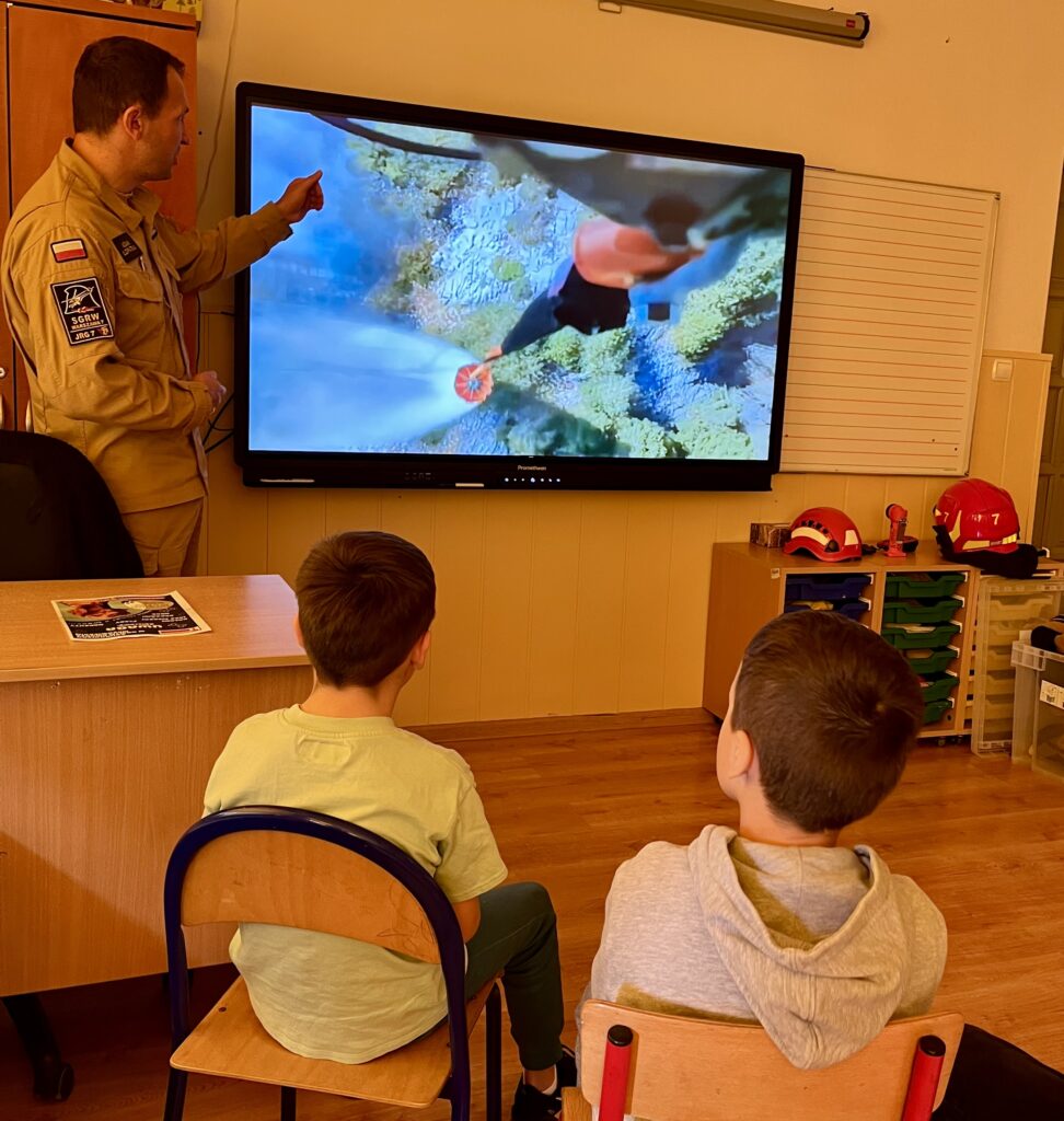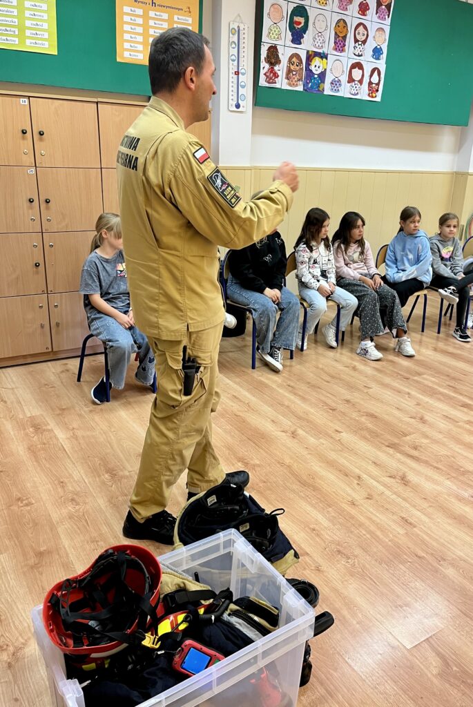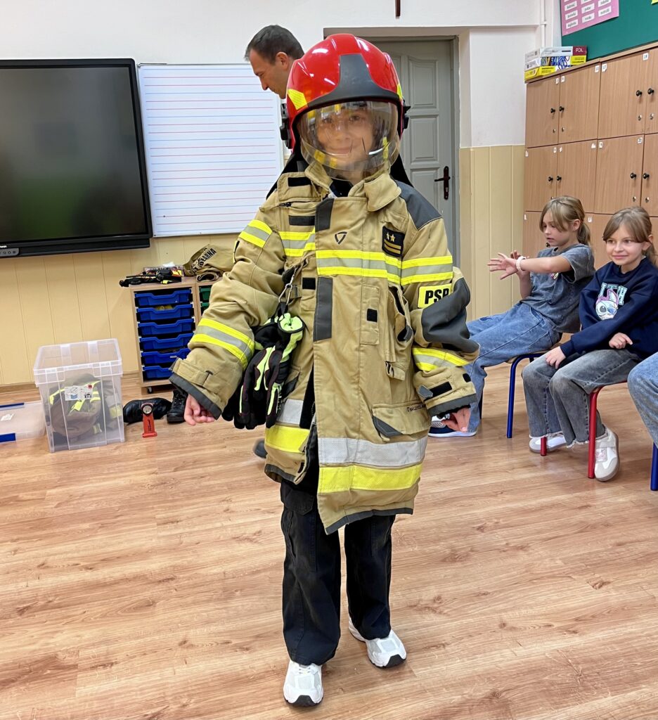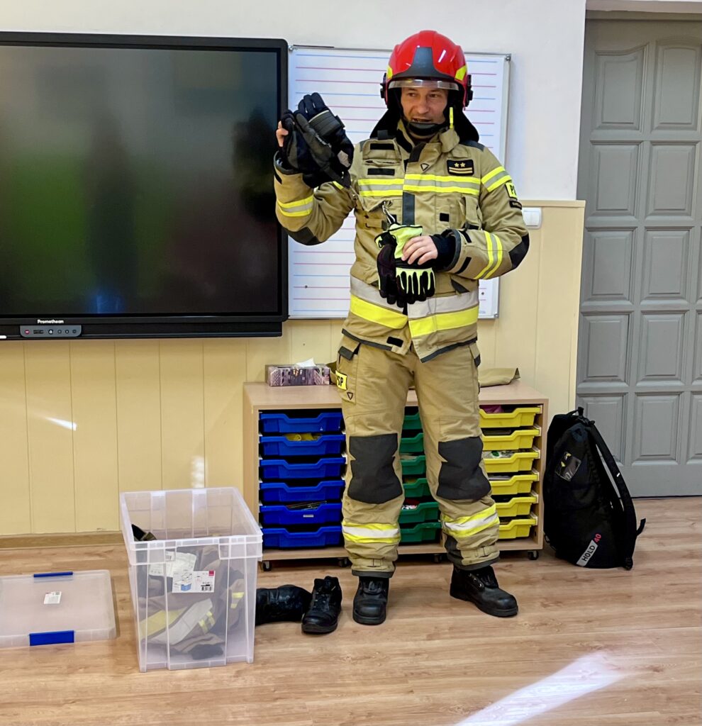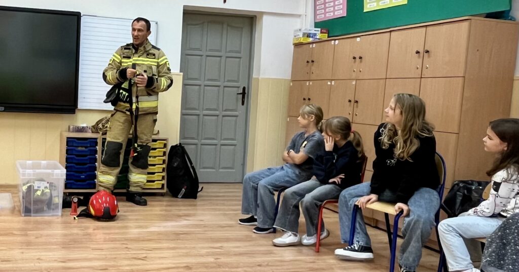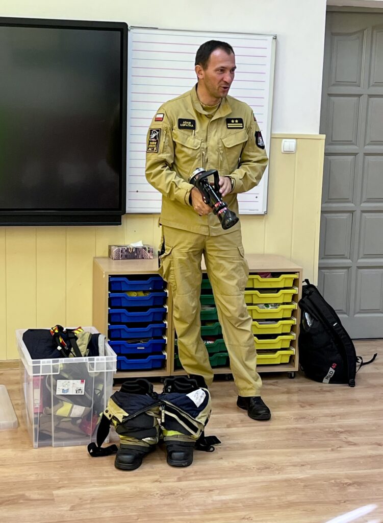 Pan Adam opowiedział o różnych akcjach ratunkowych, pokazał sprzęt wykorzystywany w pracy straży pożarnej, a także przypomniał zasady bezpieczeństwa pożarowego. Spotkanie było niezwykle ciekawe i inspirujące – dzieci chętnie zadawały pytania i aktywnie uczestniczyły w warsztatach.