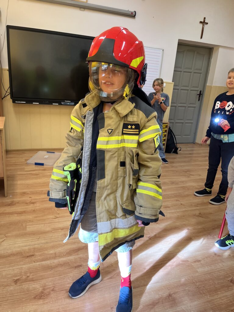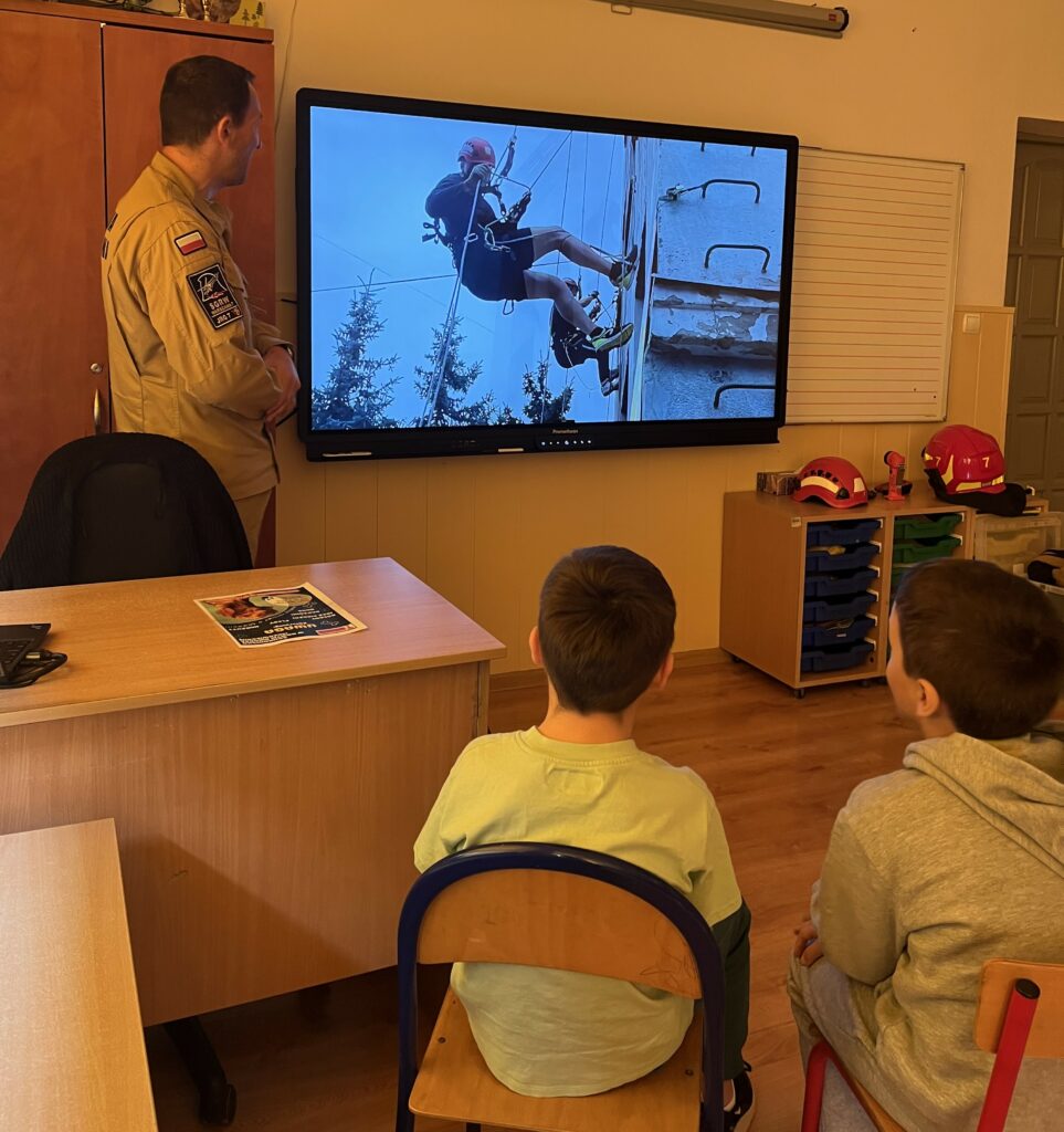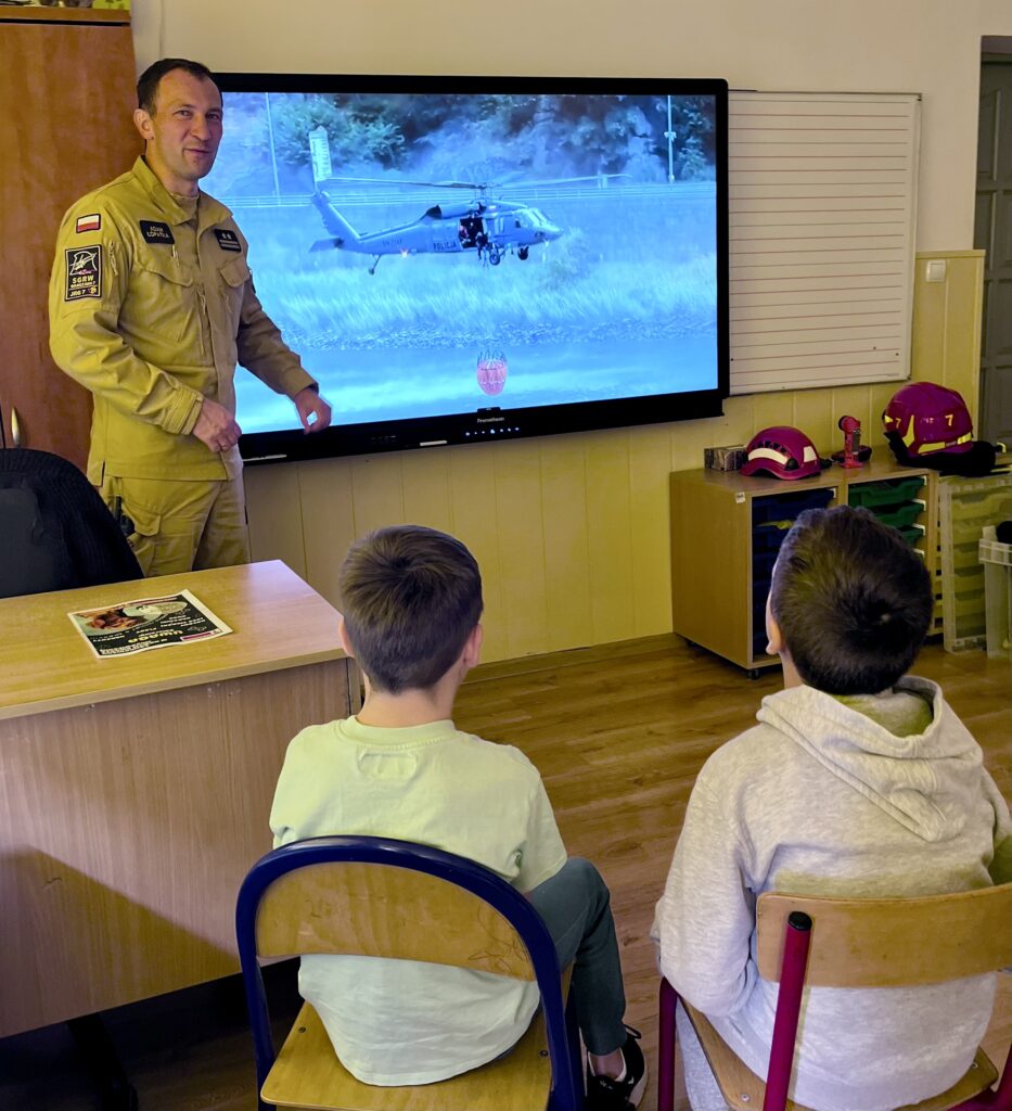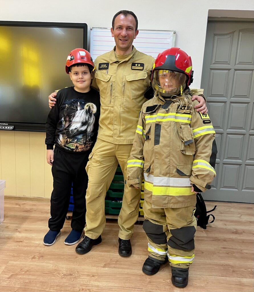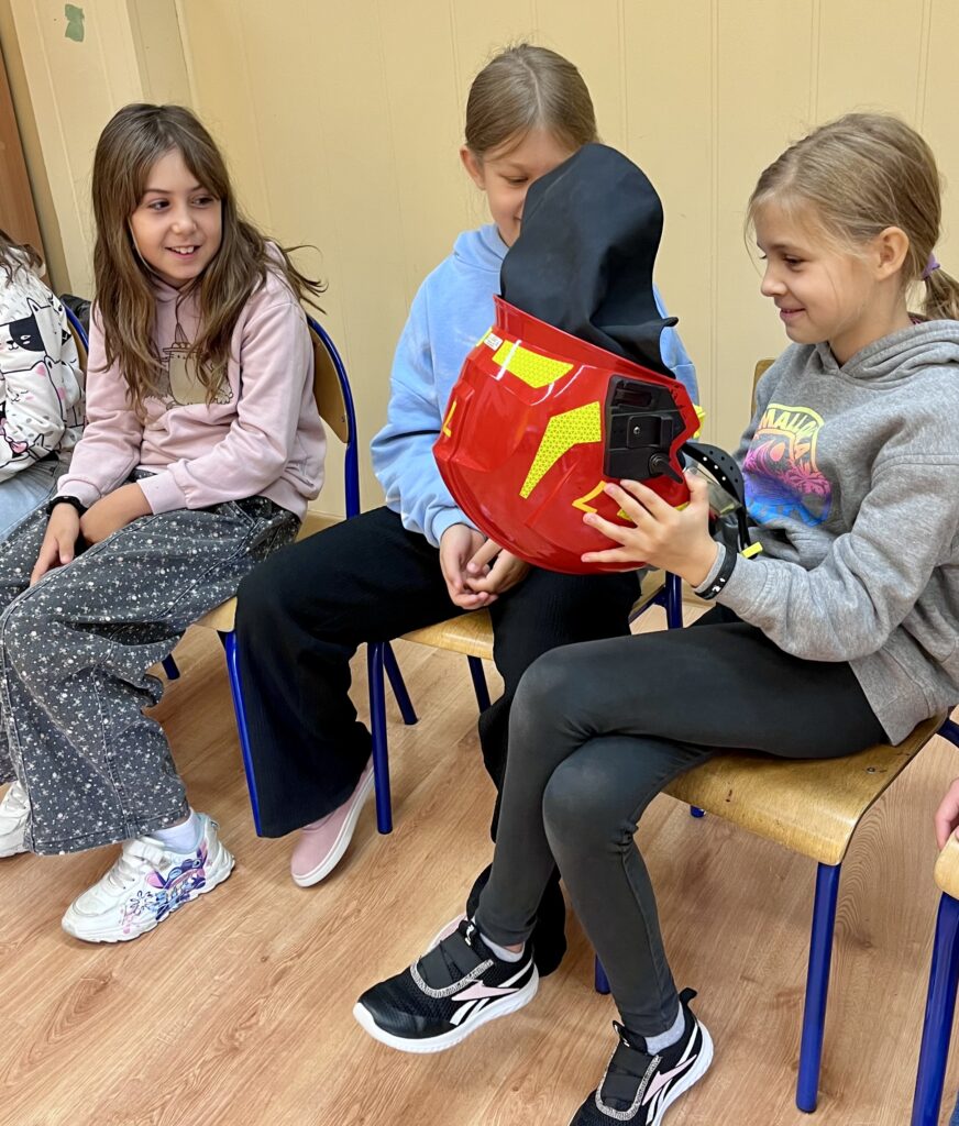 Pan Adam opowiedział o różnych akcjach ratunkowych, pokazał sprzęt wykorzystywany w pracy straży pożarnej, a także przypomniał zasady bezpieczeństwa pożarowego. Spotkanie było niezwykle ciekawe i inspirujące – dzieci chętnie zadawały pytania i aktywnie uczestniczyły w warsztatach.